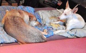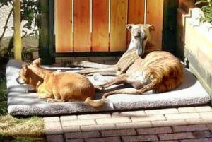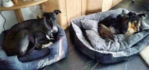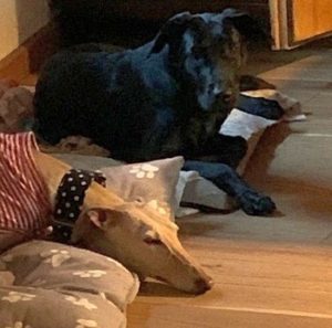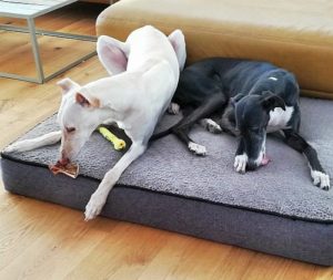 GEOFREY – Hier liegend mit seiner neuen Freundin Lucy. Die beiden Hunde haben sich vom ersten Moment an perfekt verstanden und der entspannte Geofrey hat dann sofort sein Köfferchen gepackt.