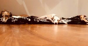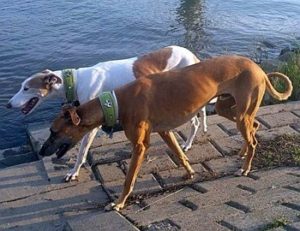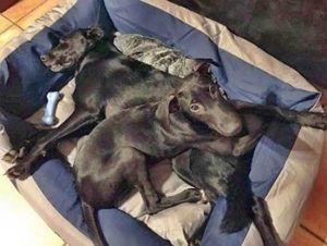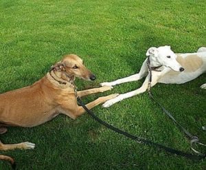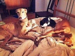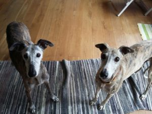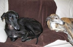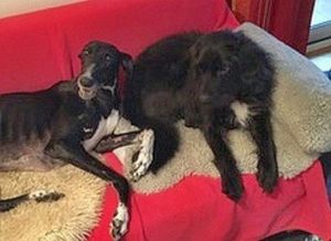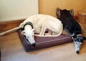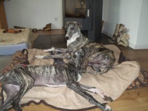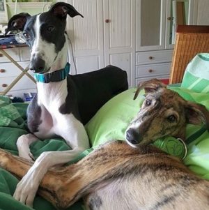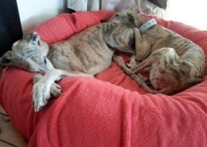 ROSQUITA (links) harmoniert mit ihrer neuen Galgofreundin einfach perfekt. Da war nach kurzer Zeit klar “die geht nicht mehr in ein anderes Körbchen”.